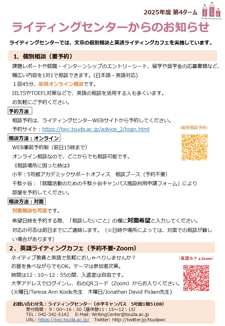 【第4ターム】個別相談と英語ライティングカフェの日程について